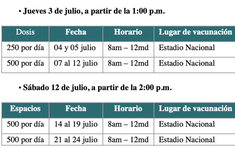 La campaña de vacunación se llevará a cabo en el Estadio Nacional en San José, en las siguientes fechas y horarios: